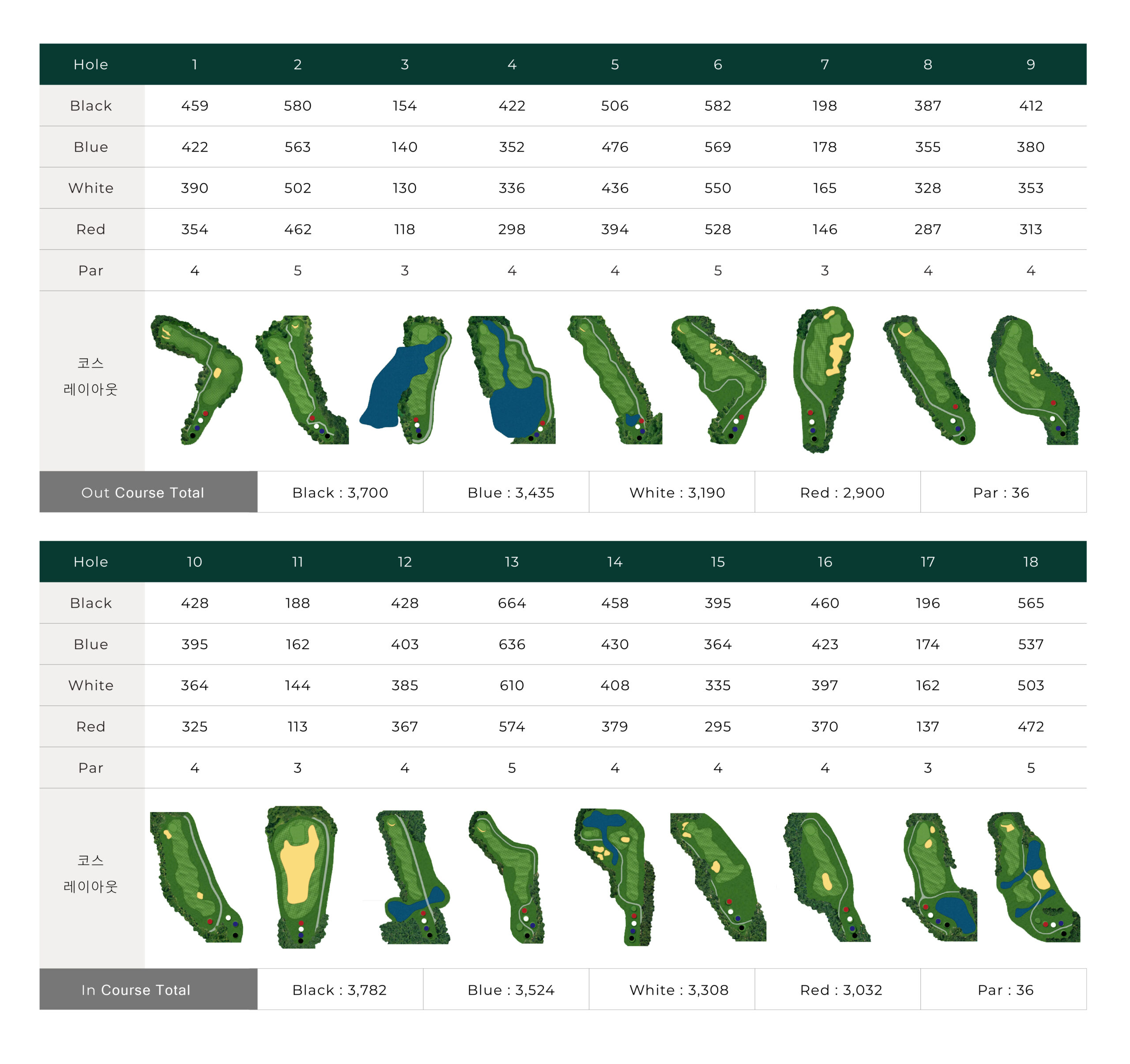 파 3 – 핸디캡 16 – 챔피언 티에서 188야드 이 파 3 홀은 거리 자체보다는 그린에서의 난이도가 더 높은 홀입니다. 그린은 왼쪽에서 오른쪽으로 경사가 져 있으며, 공을 너무 왼쪽으로 공략할 경우 경사를 따라 공이 흘러내릴 수 있습니다. 정밀한 그린 공략이 요구되는 홀입니다.